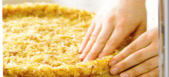 Spoon coconut mixture over center of baking stone. Using moistened hands spread crust evenly into an 11 inch circle creating a 1/2 inch rim around edge. Bake 15-18 min or until edge is slightly crisp. Remove from oven. Transfer crust and parchment paper to cooling rack. Cool Completely.