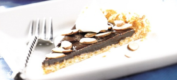Transfer tart to large round platter. Pour chocolate mixture over cooled crust, spreading evenly. Let stand 30 minutes or until chocolate is set. Sprinkle with toasted almonds ( microwave almonds for 1 to 3 minutes, stirring every 30 sec until lightly toasted). Pipe whipped topping rosettes around edge of tart using the decorator.