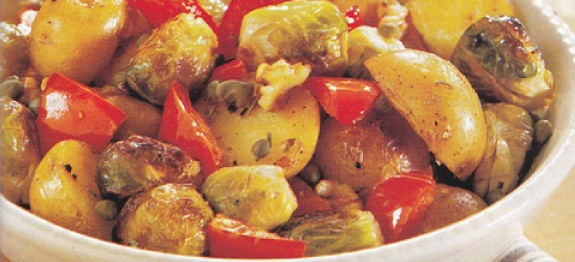 Transfer to a large bowl and stir in walnuts and capers. Whisk remaining 2 Tbls oil and vinegar in a small bowl until blended.